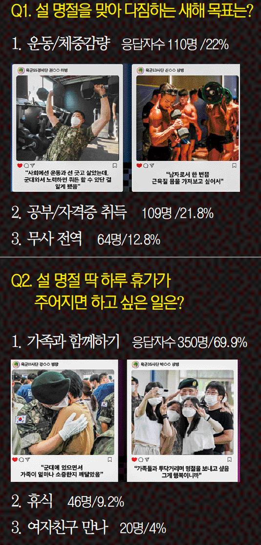 육군6사단 강○○ 일병은 ‘가족과의 시간’을 선택한 이유로 “부모님께 세배를 드리겠다”고 답했다.