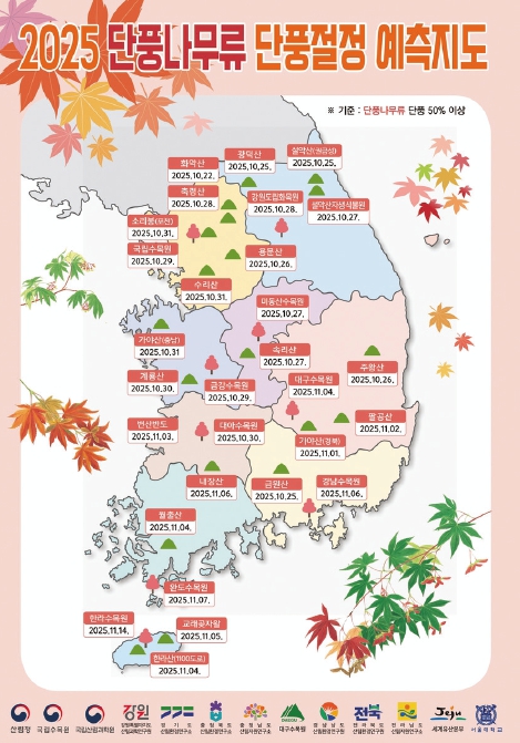 산림청이 발표한 한반도 주요 산림의 단풍 절정 시기를 담은 ‘2025년 산림단풍 예측지도’에 따르면 올해 단풍은 지역과