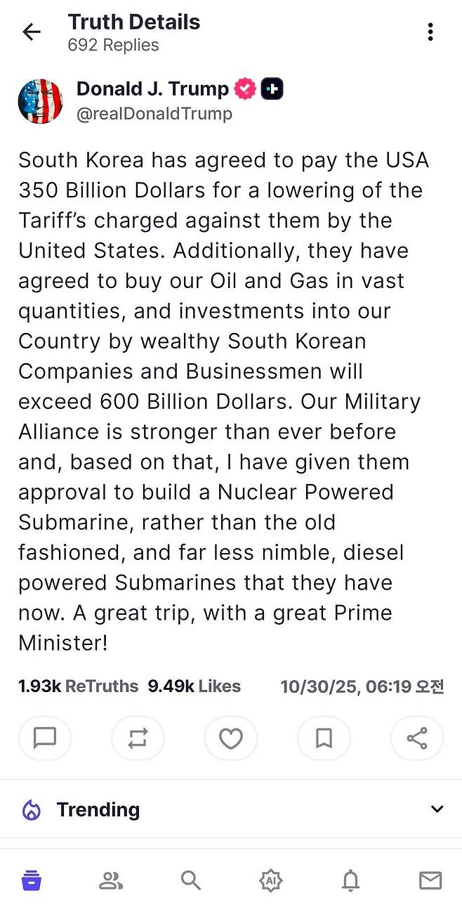 30일 트럼프 대통령은 자신의 소셜미디어 ‘트루스소셜’을 통해 “한국이 핵추진 잠수함을 건조할 수 있도록- 승인했다. 한국은 훌륭한 미국 필라델피아 조선소에서 이를 건조할 것”이라고 밝혔다. 전날 한·미 정상회담